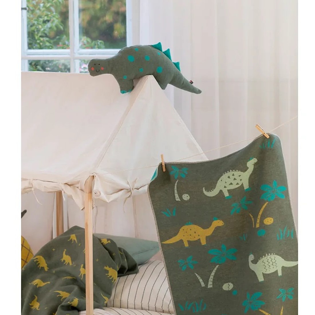 Diese wunderbare Accessoire passt perfekt zu der Baby- und Kinderdecke DINOS. Aber auch solo ist das gefüllte Kissen DINO hervorragend geeignet zum Kombinieren und Dekorieren. Und vom allerersten Moment an kann es zum Lieblingskissen und Begleiter für echte DINO Fans werden