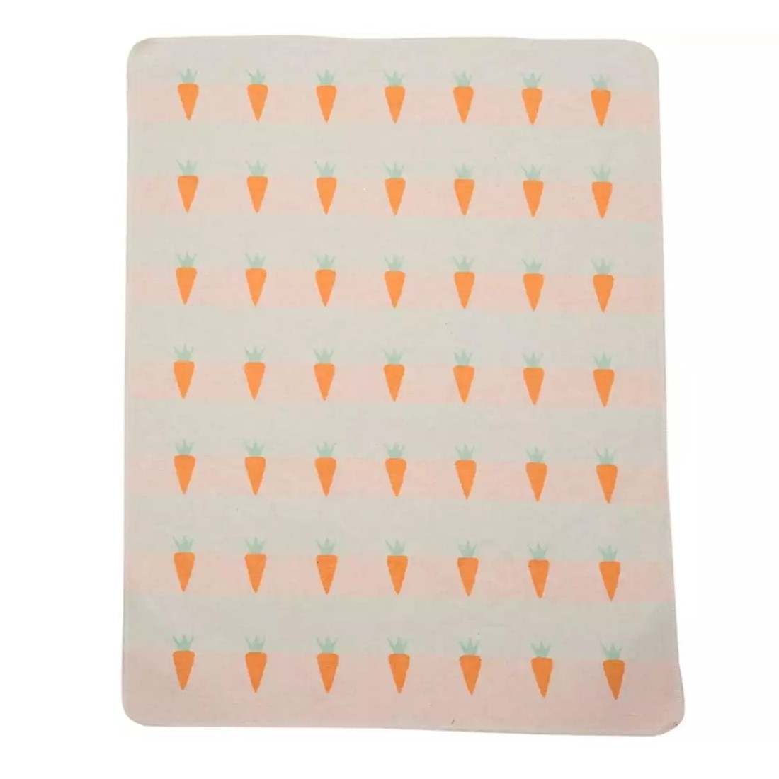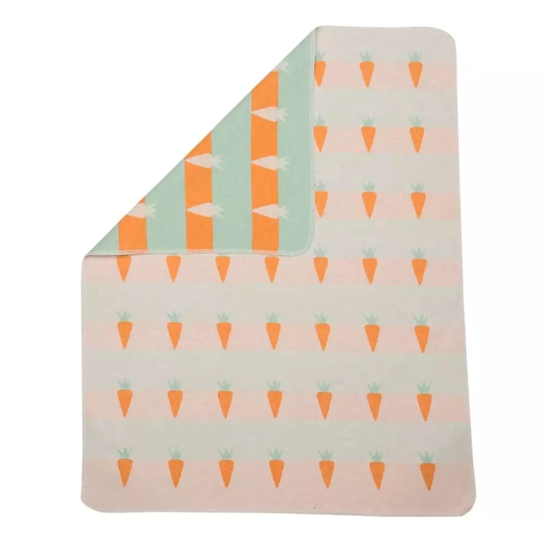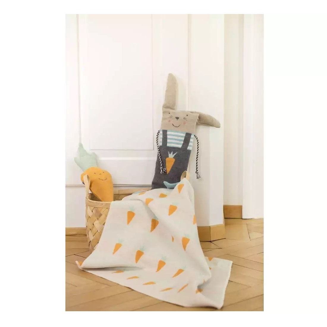 Die Flanell Schmusedecke mit Blockstreifen Design und lustigen Karotten ist ringsum gekettelt. Zusammen mit der Hasenpuppe ist dieses Set ein Highlight im Kinderzimmer und auch auf Reisen ein unentbehrlicher Begleiter.