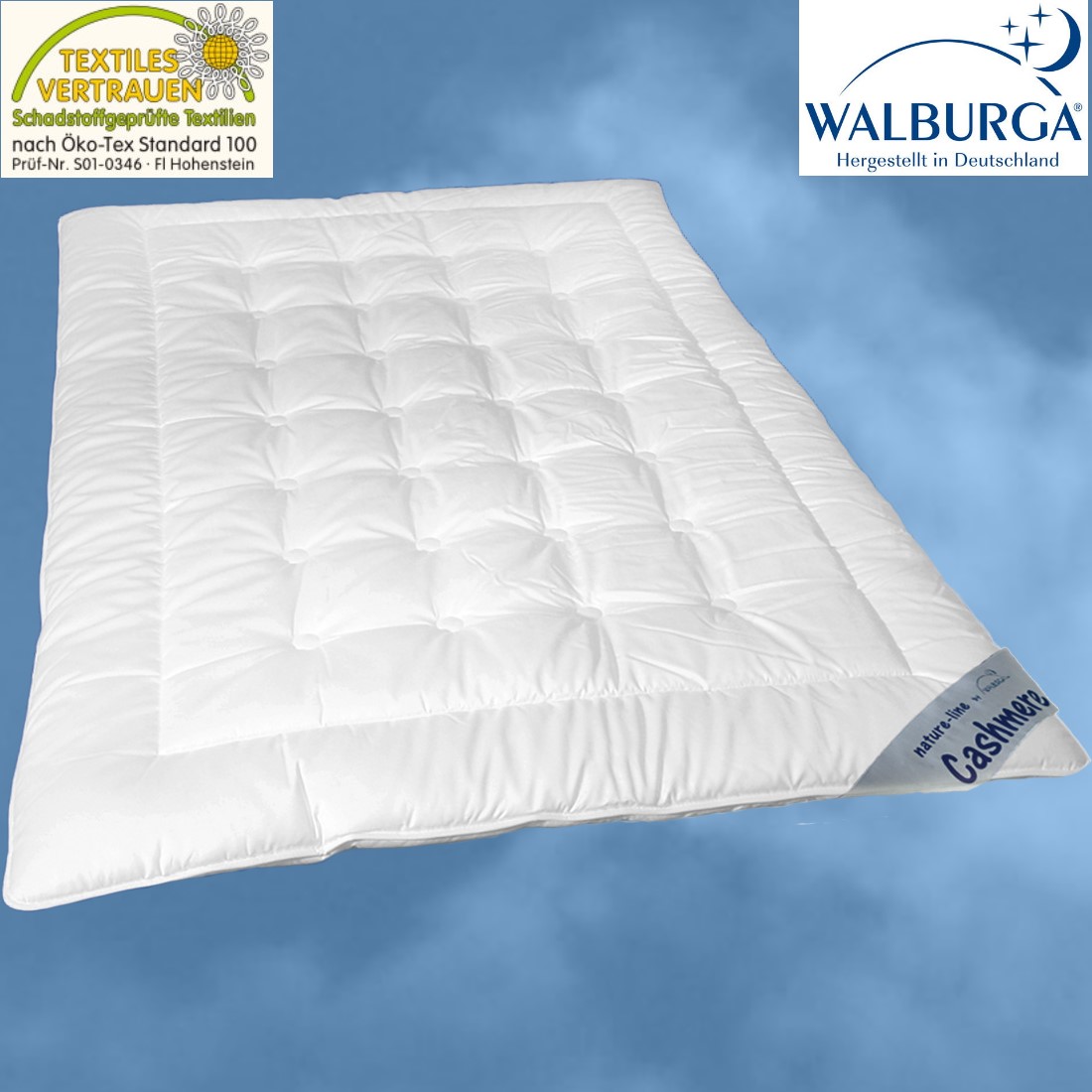 Genießen Sie ein herrliches Schlafklima auch in der warmen Jahreszeit mit dem Kaschmir Sommer Steppbett von WALBURGA®. Mit einer Füllung aus 100% hochwertigem Kaschmir, und einem Feinbatist Bezug (Nm 150) aus 100% Baumwolle erleben Sie eine unglaublich anschmiegsame Luxus Kaschmir Bettdecke. Die außergewöhnlichen Klimaeigenschaften von Kaschmir und ein sehr gutes Feuchtigkeitsmanagement sorgen für ausgeglichenes und angenehm trockenes Schlaferlebnis.