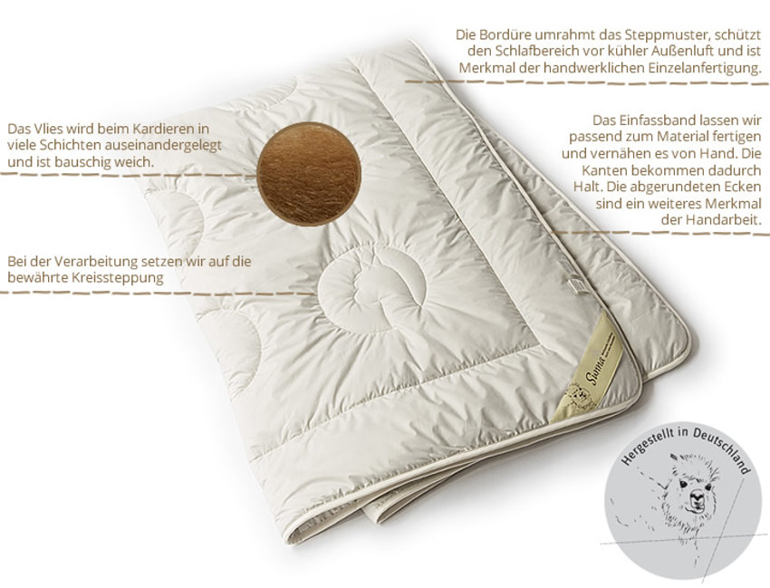 Hergestellt wird diese Alpaka Bettdecke Winterdecke in allen Arbeitsstufen von einem handwerklich kompetenten und im Umgang mit diesem sehr wertvollen Rohstoff erfahrenen Familienbetrieb in Deutschland.