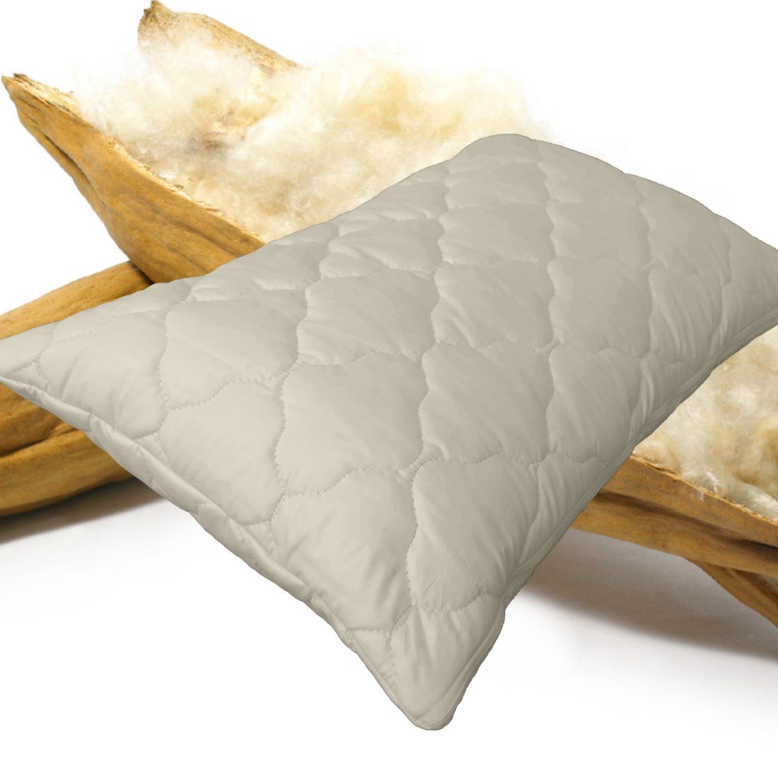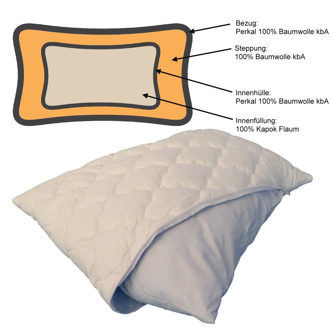 Der hautfreundliche Perkal Bezug aus 100% Baumwolle aus kontrolliert biologischem Anbau (kbA) ist mit einer Baumwollschicht ebenfalls aus kontrolliert biologischem Anbau (kbA) versteppt. Auch die Perkal Innenhülle besteht aus 100% Baumwolle kbA. Sowohl der Bezug als auch die Innenhülle sind jeweils mit einem Reißverschluss ausgestattet. Die Füllung besteht aus einem herrlich leichten Flaum aus 100% Kapok. Diese wunderbar weiche und atmungsaktive Naturfaser wird nicht von ungefähr auch als pflanzliche Daune bezeichnet. Die Füllmenge kann durch Entnahme oder Zufüllung individuell gestaltet werden. Unsere Kissen werden stramm gefüllt ausgeliefert. Der Materialmix mit Baumwolle und Kapok steht für hervorragende Klimaeigenschaften und ein angenehm trockenes Schlafklima.