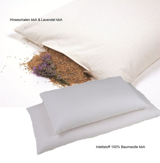 Eine Kombination die Sinn macht und beruhigt. Milbenfreie, atmungsaktive Hirseschalen kbA und Lavendel kbA. Anschmiegsame Hirseschalen und beigemischt das Gute-Nacht-Kraut schlechthin. Die nervenberuhigenden Lavendel Blüten, die lila Schlafwunder wirken hier direkt an der Quelle und sorgen für die Einschlafpower.