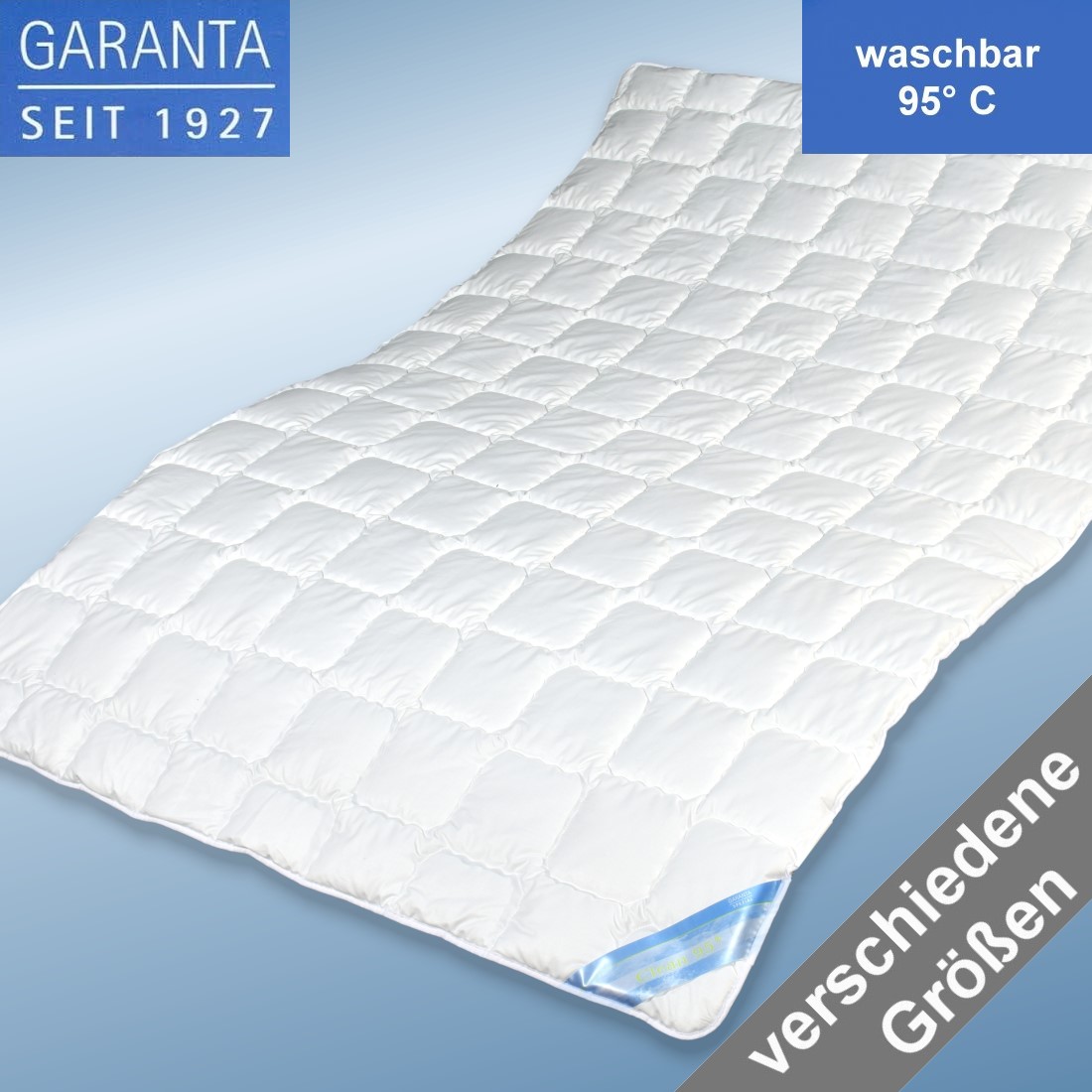 Hier präsentieren wir die tumbler- und kochfeste Sommer Bettdecke Clean 95. Durch den Bezug aus 100% Baumwolle hat diese Sommer Bettdecke einen besonders angenehmen Griff und ist sehr hautfreundlich. Durch den mechanisch vorgerupften (sanforisiert) Bezugsstoff behält die Decke auch nach der 95° C Wäsche annähernd die ursprüngliche Größe und zudem kann durch die mechanische Ausrüstung auf chemische Zusätze verzichtet werden. Die Clean95 ist eine robuste Sommer Bettdecke und durch die Karosteppung besonders formstabil. Der weiße Baumwollperkal aus Baumwolle und die Füllung aus 100% silikonisierter, spiralgekräuselter Hohlfaser macht diese Decke bei 95° C waschbar und tumblergeeignet. Decken aus der Garanta Serie Clean 95 sind ganz besonders für hygienebewusste Menschen und Allergiker geeignet und vermitteln ein ausgesprochen gutes Schlafgefühl.