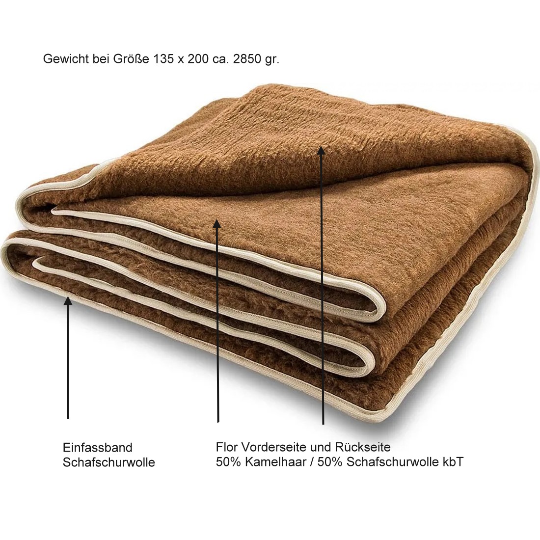 - Ausführung: Beidseitig 100% Kamelhaar mit Merino Schurwolle kbT