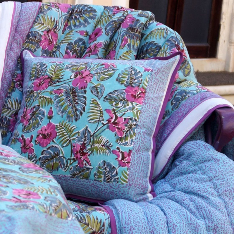 Sommerfeeling und Urlaubsstimmung für Ihr Zuhause. Tropische Farben in Türkis, Pink und Grüntönen im Hand Stempeldruck mit viel Liebe umgesetzt. Die bunte Blütendruckseite oder die schlichtere Rückseite sind vielfach kombinierbar und ein Hingucker in jedem Wohnraum. Der Bezug aus 100% Baumwolle und die Füllung aus fluffig leichtem Polyestervlies verleihen der Decke sehr gute Klimaeigenschaften. Die Steppung verhindert ein Verrutschen der Füllung.