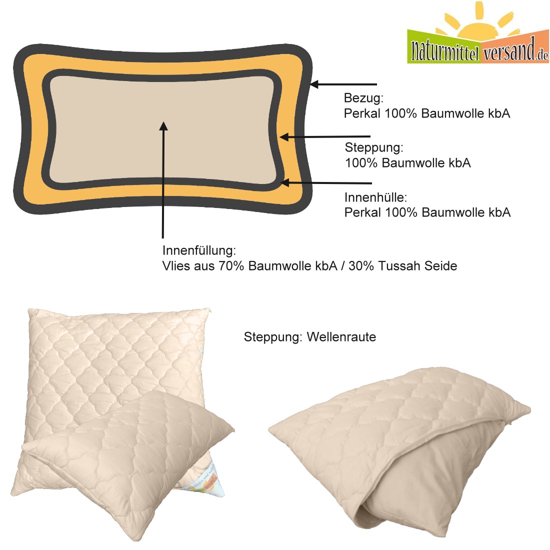 Der hautfreundliche Perkal Bezug aus 100% Baumwolle kbA ist mit einer Baumwollschicht ebenfalls aus kontrolliert biologischem Anbau (kbA) versteppt. Die Perkal Innenhülle besteht ebenfalls aus 100% Baumwolle kbA und ist wie auch der Bezug mit einem Reißverschluss ausgestattet. Das Vlies für die Füllung besteht aus 70% Baumwolle kbA und 30% Tussah Seide. Diese wunderbar weiche, natürliche und atmungsaktive Füllung sorgt für hervorragende Klimaeigenschaften und ein angenehm trockenes Schlafklima.