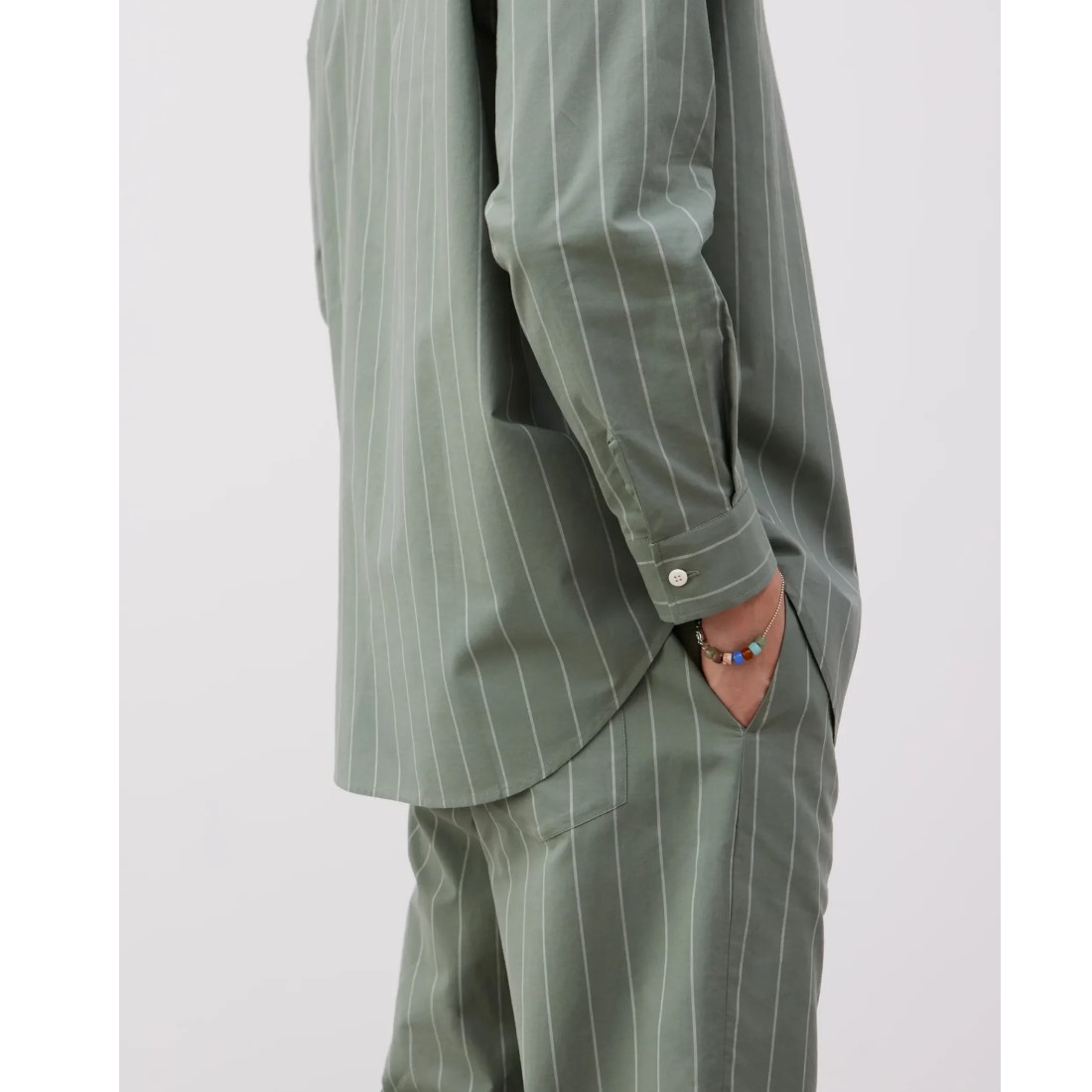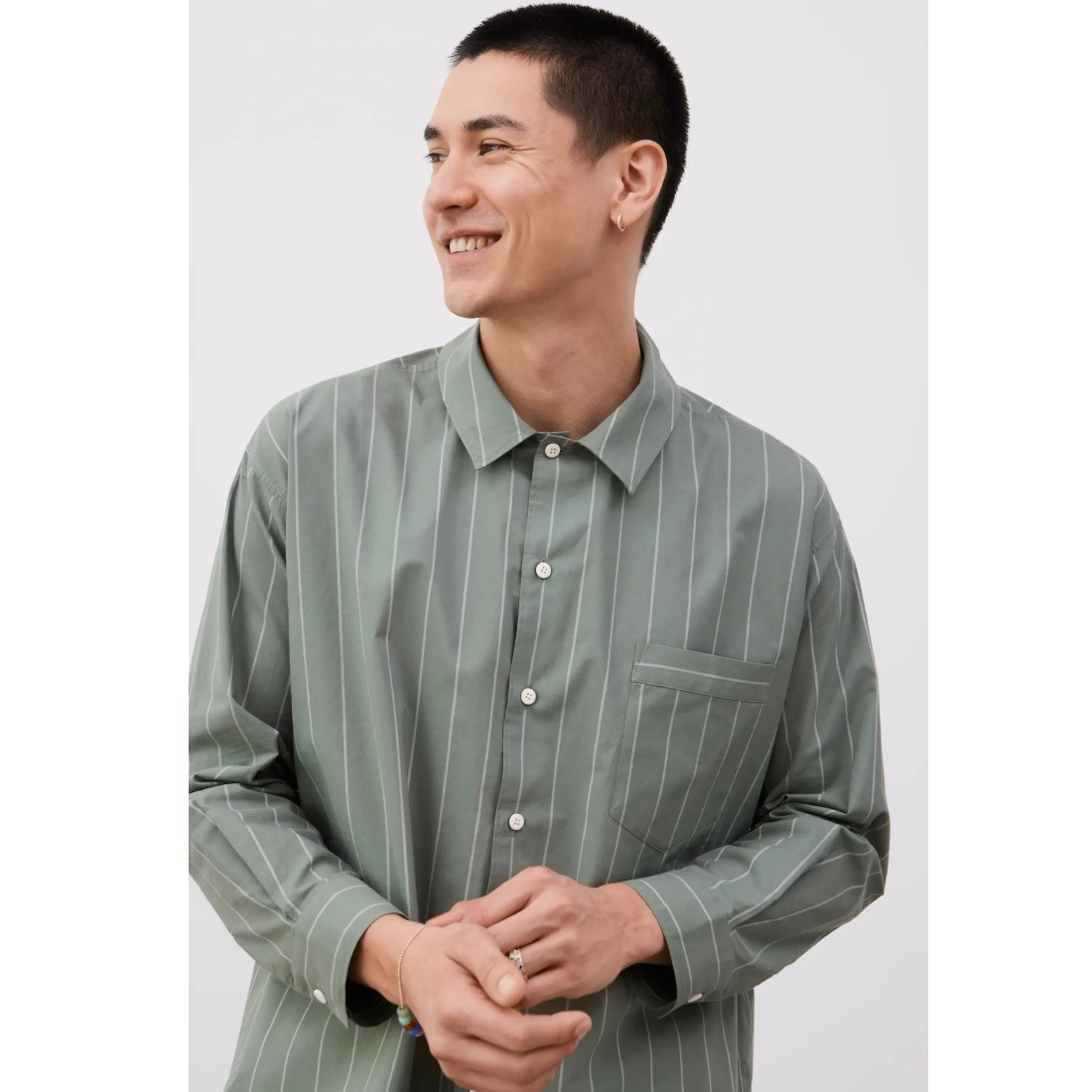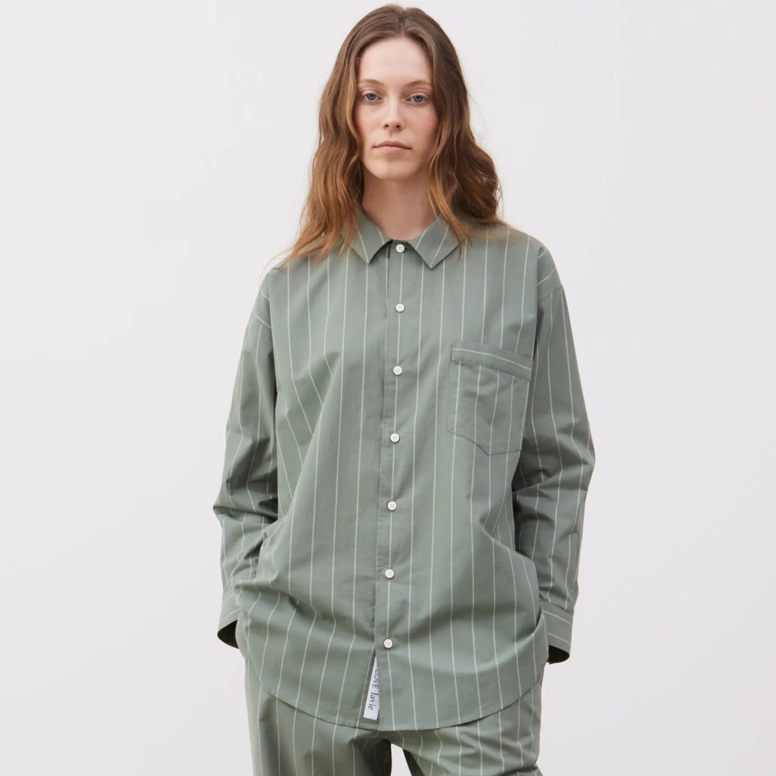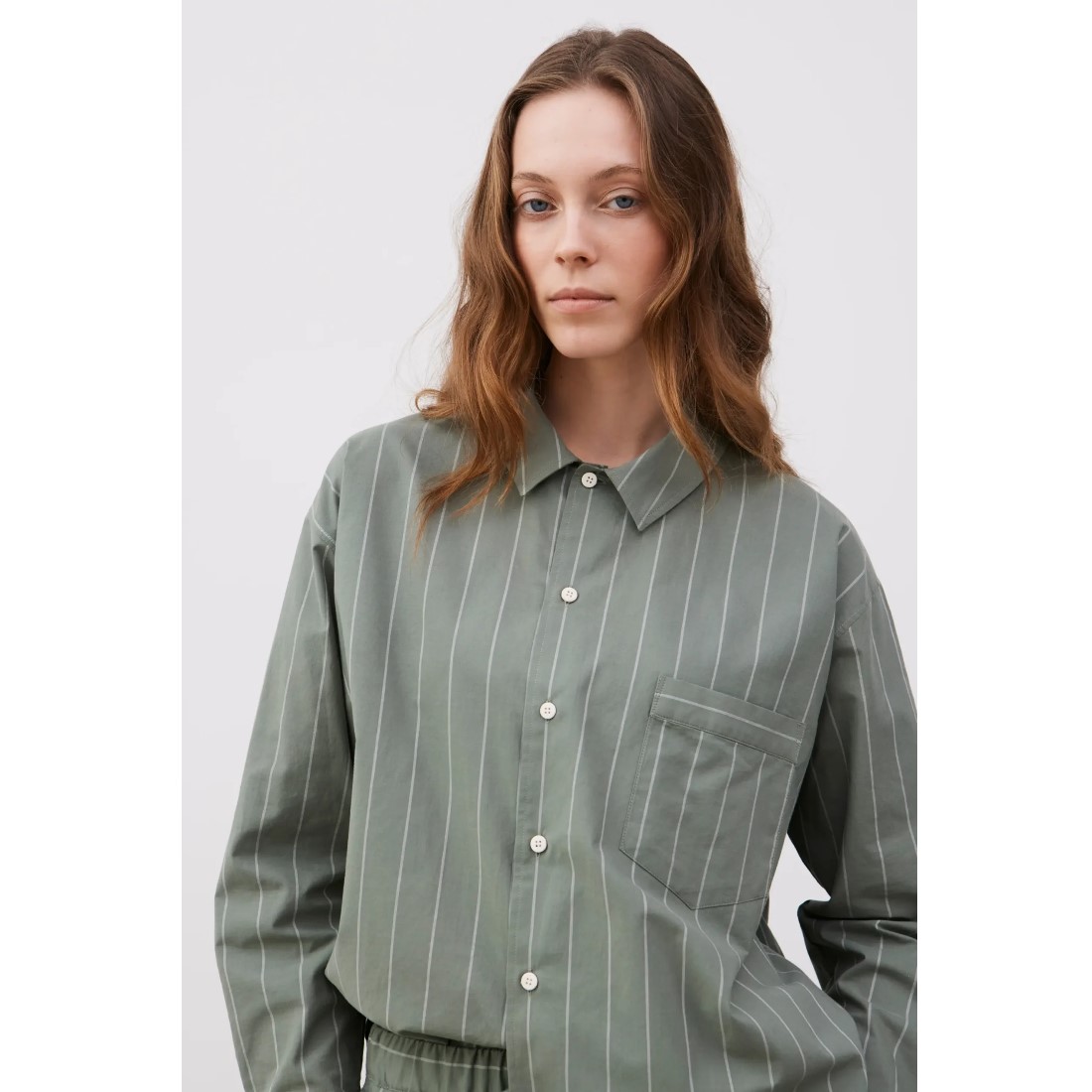 Das Oversize‑Shirt besteht aus garngefärbter Bio‑Baumwolle und trägt sich weich, atmungsaktiv und unkompliziert. Der feine Nadelstreifen verleiht dem Stoff eine ruhige, zeitlose Struktur, während der lockere Schnitt mit leicht überschnittener Schulter für Bewegungsfreiheit sorgt. Die aufgesetzte Brusttasche und die Knöpfe aus recycelten Baumwollfasern runden das Design natürlich ab.