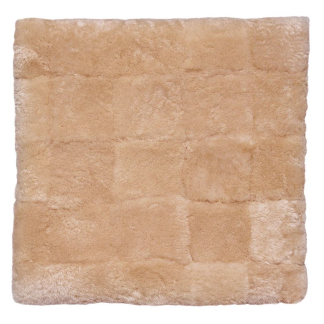 Sitzkissen aus geschorenem Lammfell auf der Oberseite, zusammengesetzt aus Einzelstücken mit je ca. 8x8 cm. Die Füllung besteht aus einer Schaumstoffeinlage aus Polyester und die Rückseite oder Unterseite ist mit Stoff abgefüttert.