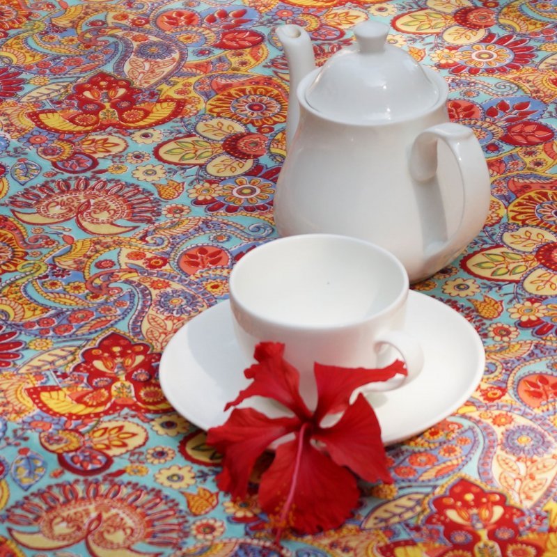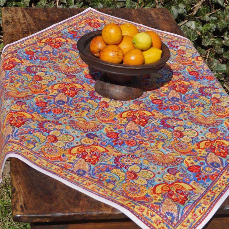 Das beliebte "gute Laune Muster" aus unserer Indigo Serie gibt es als Decke, Kissen und nun auch als Tischdecke. Unterschiedliche Blautöne mit Rot, Orange und gelb gemischt ist genauso ein optisches Highlight wie die Decke und das Kissen. Das Paisley Muster ist farbenfroh, verschnörkelt und romantisch mit einem Hauch von Flower Power.