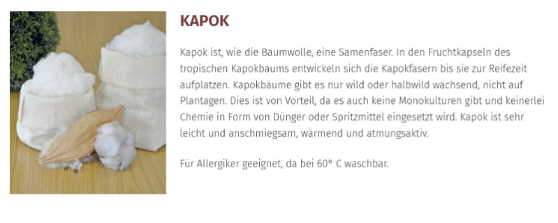 Kapok-Artikel sind bei 60° C waschbar, daher für Allergiker geeignet.