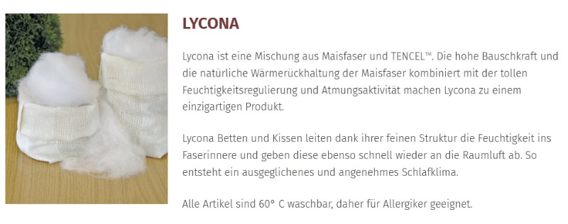 Entdecken Sie LYCONA Bettdecken und erleben Sie das angenehme und ausgeglichene Schlafklima der genialen Kombination von Maisfaser und Tencel umhüllt von einem Feinbatist aus 100% Bio Baumwolle aus kontrolliert biologischem Anbau (kbA)
