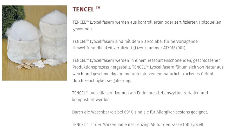 Die Regeneratfaser TENCEL®Lyocell wird aus dem natürlichen Rohstoff Holz industriell hergestellt und ist zu 100% biologisch abbaubar und daher besonders umweltschonend. Der Markenname ist TENCEL®, die Faserbezeichnung ist Lyocell.