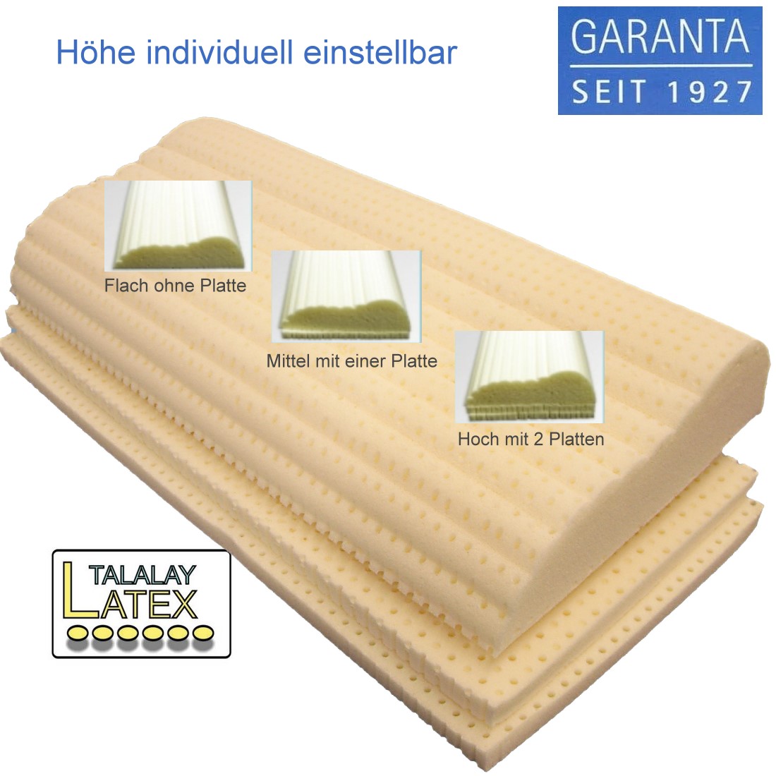 Der Kern und die 2 Platten des Vario Select LATEX bestehen aus Talalay-Latex. Mit Hilfe der 2 Platten kann die Höhe des Kissens verstellt und individuell angepasst werden. Das Nackenstützkissen bietet dadurch maximale Flexibilität und kann für die Bedürfnisse der verschiedenen Schläfertypen eingestellt werden und für die richtige Lagerung der Halswirbelsäule sorgen. Dazu können Sie das Kissen wahlweise entweder ohne, mit einer oder mit zwei Einlegeplatten benutzen. Durch die wellenförmige Oberfläche gewährleistet das Nackenstützkissen eine sehr gute Anpassung an die Kopfform sowie eine komfortable Stütze im Nackenbereich.