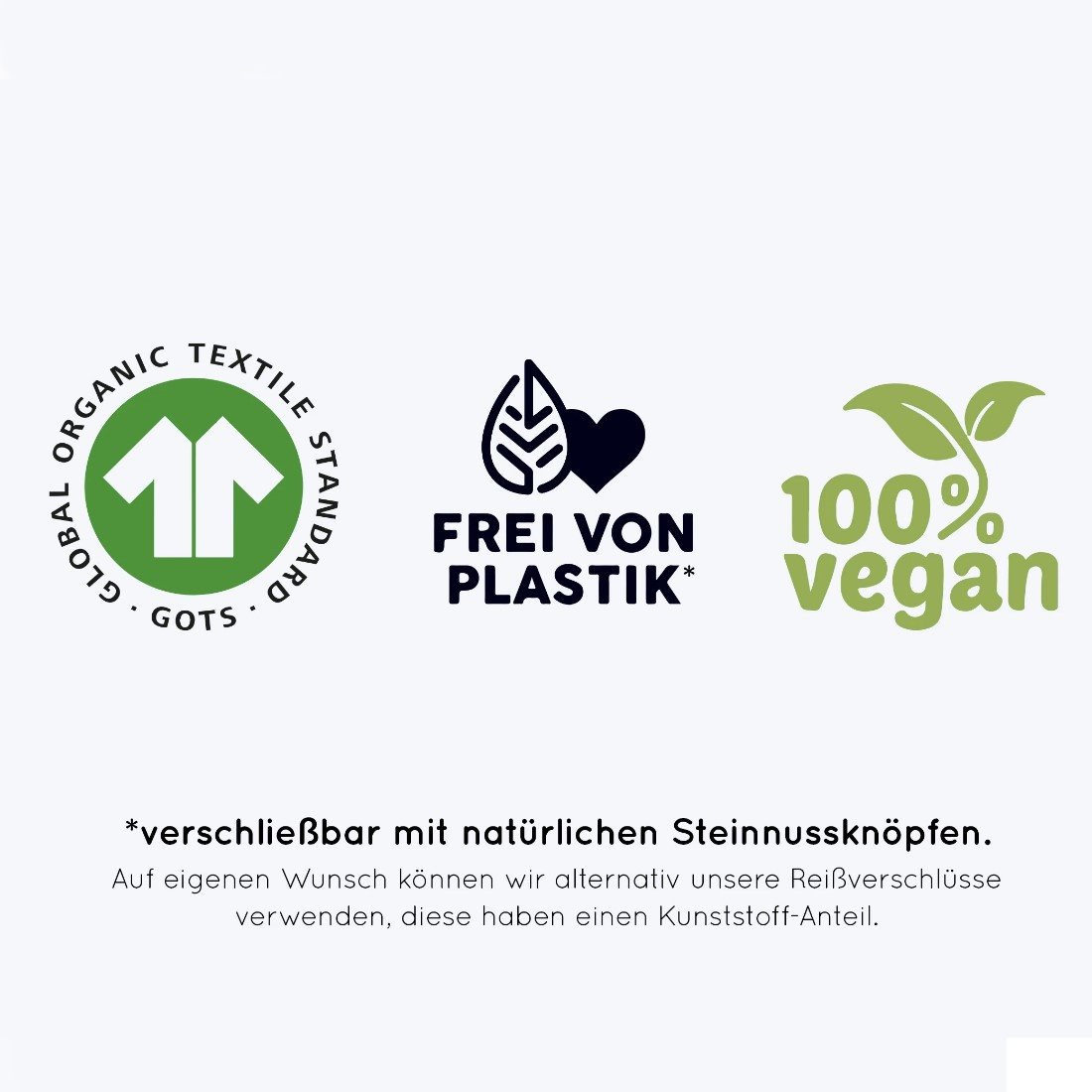 - Verschluss (Standard): Steinnussknöpfe, auf Sonderwunsch mit Reißverschluss (enthält Kunststoff)