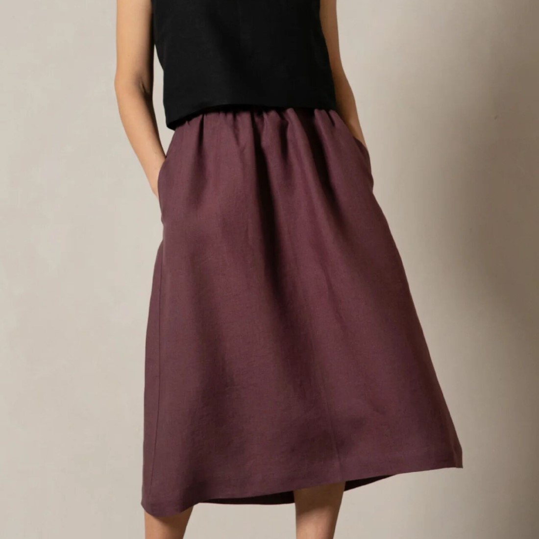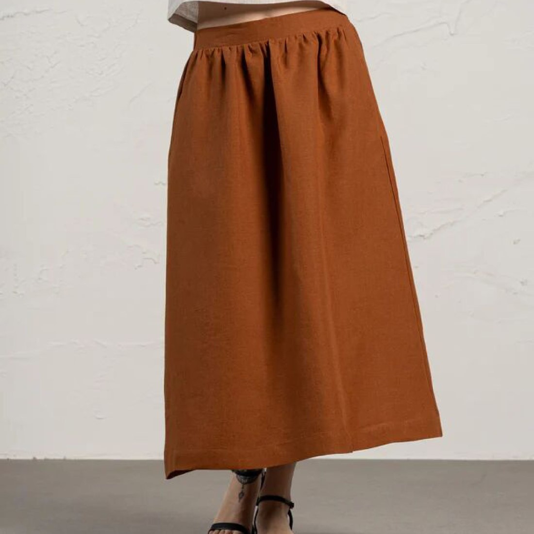 Der Rock fällt größengetreu aus. Durch die sanfte A‑Linie wirkt der Hüftbereich leicht voluminöser, ohne aufzutragen. Leinen wird im Laufe des Tages weicher und passt sich deinen Bewegungen an.