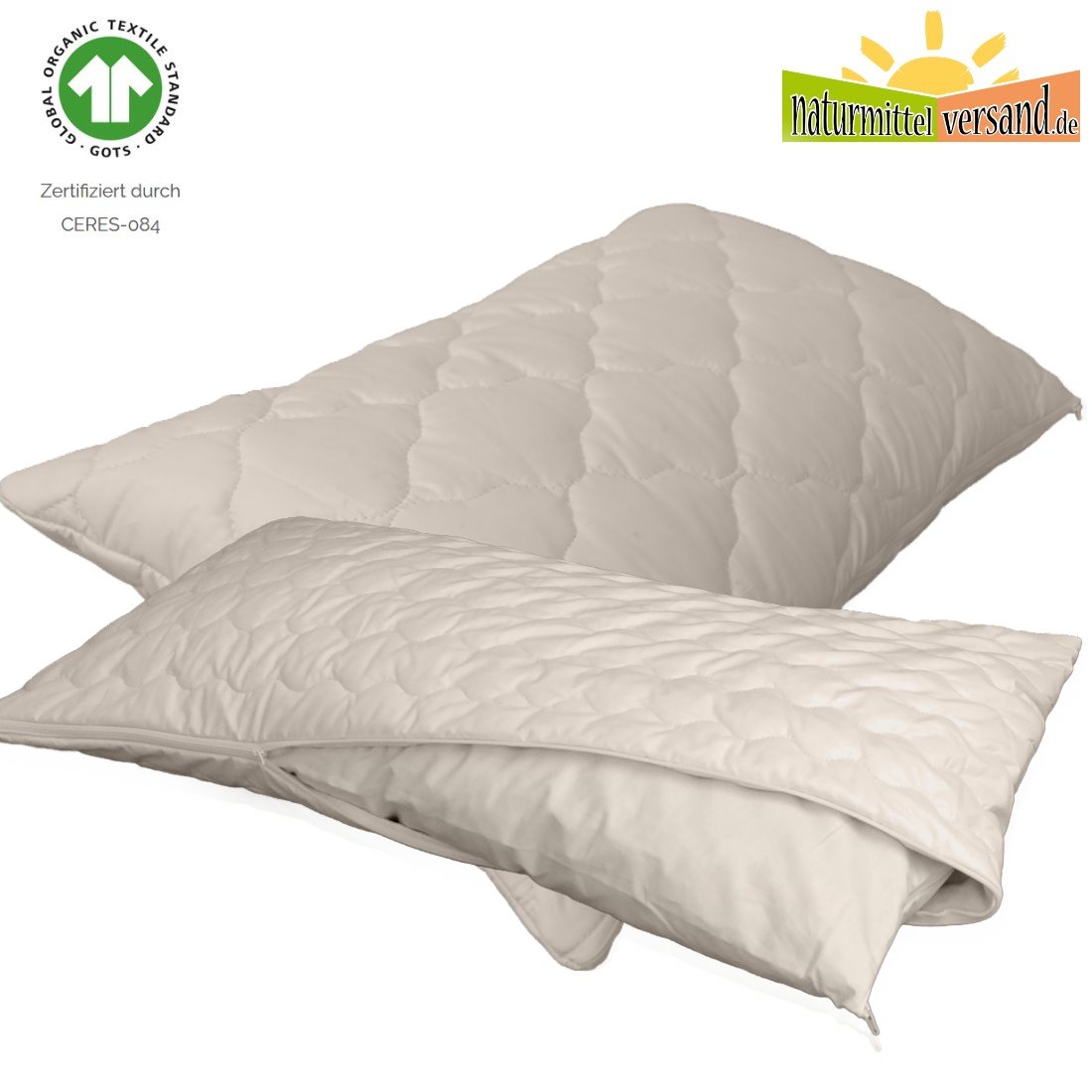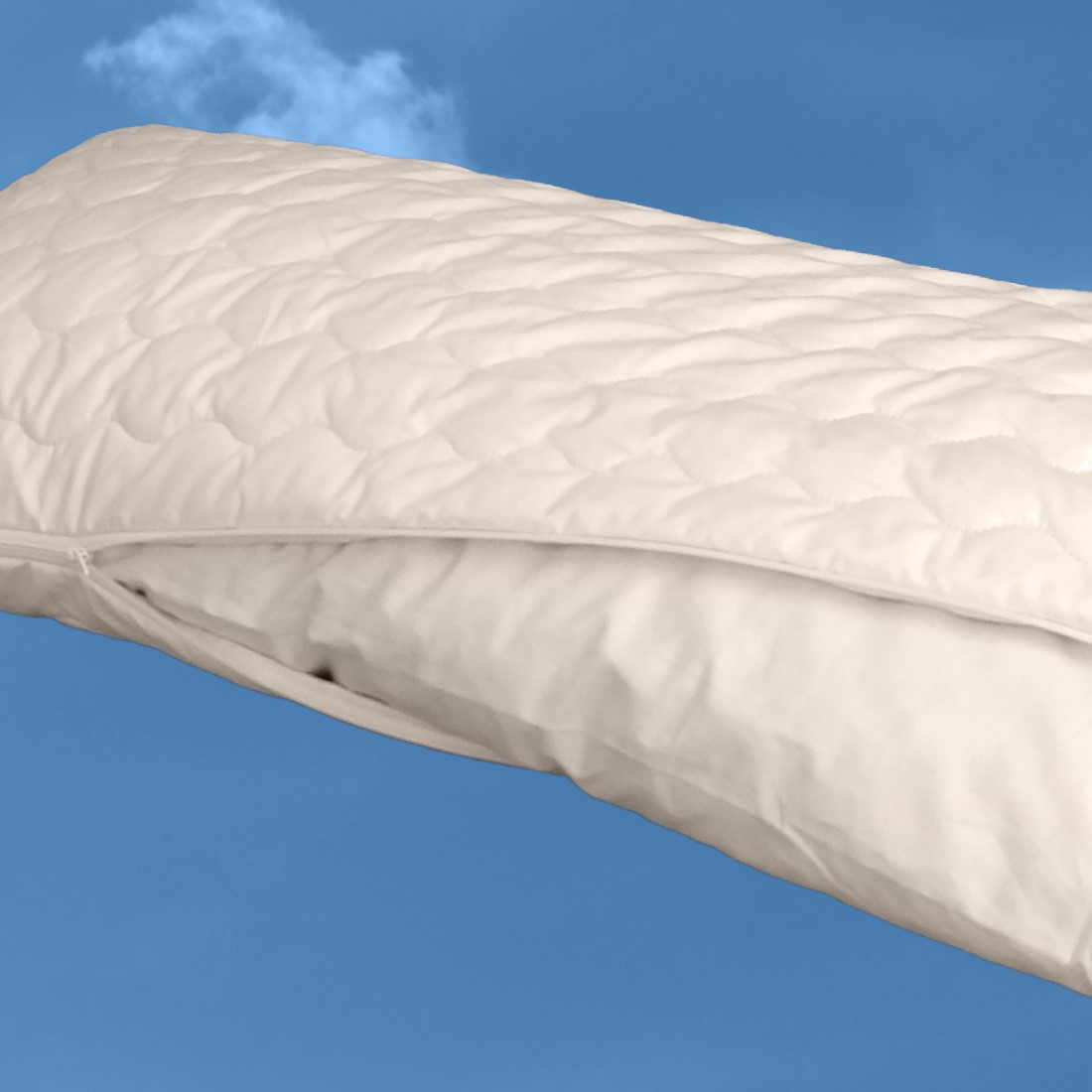 besteht aus einem hautfreundlichen Perkal aus 100% Baumwolle aus kontrolliert biologischem Anbau (kbA) und ist versteppt mit 100% Bio Baumwolle kbA. Das Innenkissen ist ebenfalls ein kbA Perkal aus 100% Baumwolle und wie der Bezug auch mit einem Reißverschluss ausgestattet.