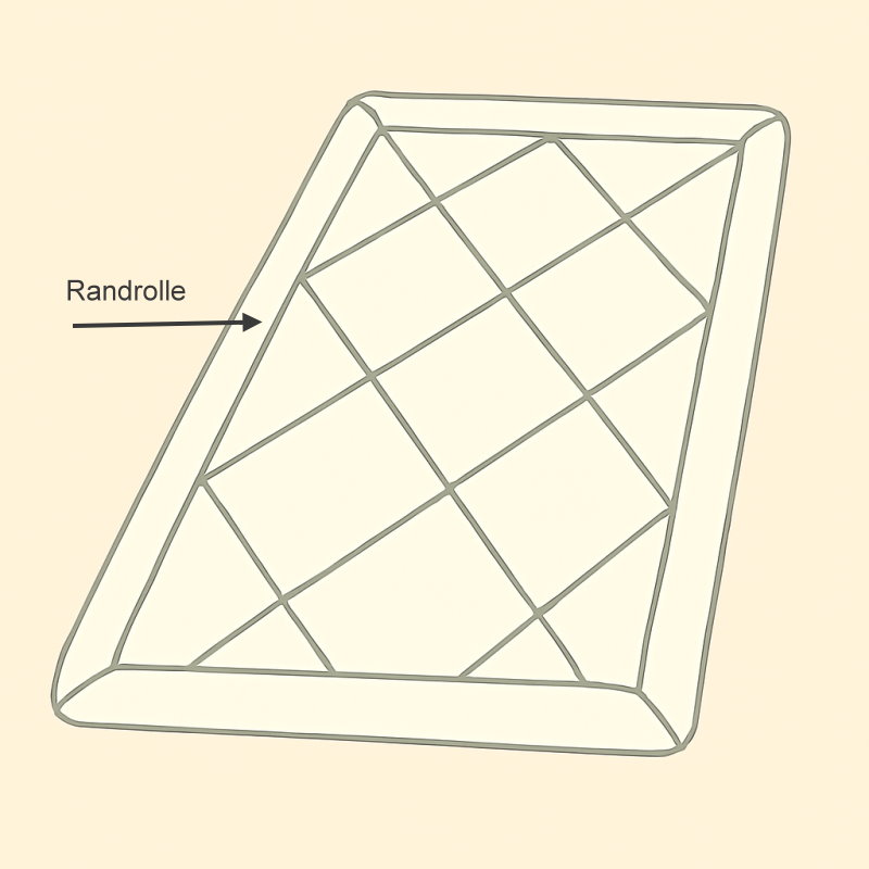 Die Randrolle bezeichnet eine etwa 15–20 cm breite Steppung, die sich rund um die gesamte Bettdecke zieht. Sie wird gezielt mit Füllmaterial versehen und fest abgesteppt, sodass ein wärmender Rahmen entsteht, der die Decke stabilisiert und gleichzeitig die Schlafhöhle besser gegen äußere Einflüsse abschirmt.