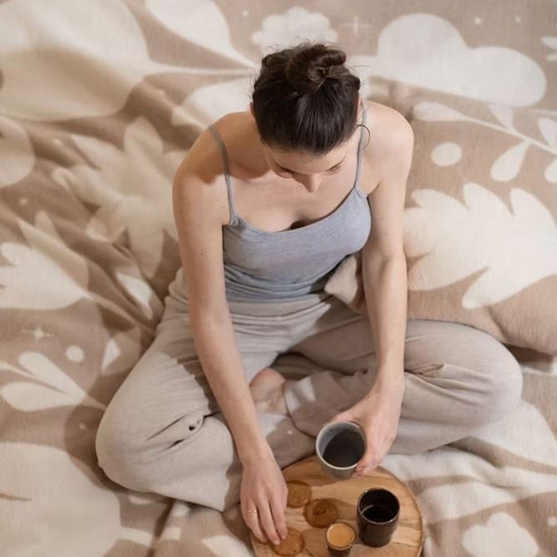 - Ja, die Decke besteht aus atmungsaktiver Recycling-Baumwolle und ist frei von Schadstoffen – ideal für empfindliche Haut.