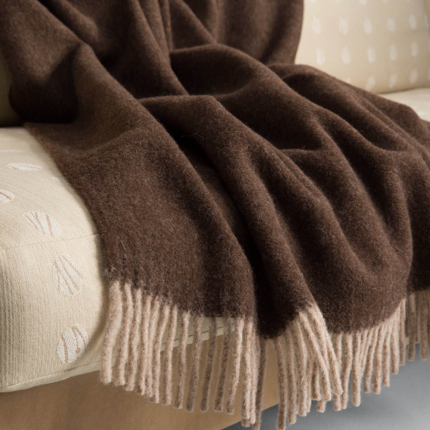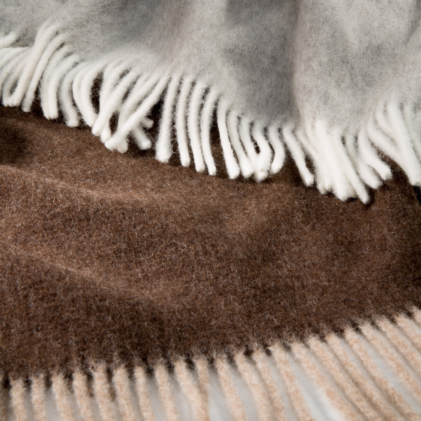Die Wohndecke ist in unauffälligen, aber warmen Farben gestaltet. Das sogenannte Doubleface-Farbdesign gibt es in verschiedenen Grau- und Brauntönen: